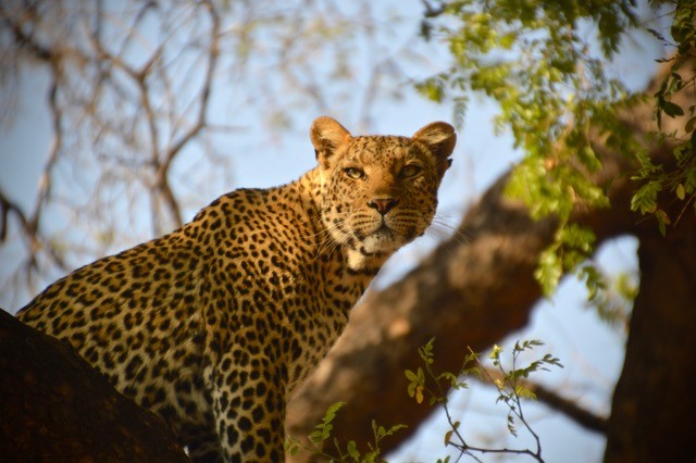 A few days later, we heard rumors of another leopard with a young cub. Our guides told us that timing is everything in the bush, both in terms of seeing specific species of wildlife and, also, in terms of witnessing interactions between them. Again, after bushwhacking through uneven terrain heavy with shrubs, we were thrilled to see the rumored adult leopard and cub standing together adjacent to a tree. A large and mangy hyena entered the scene. We were well positioned and wide-eyed. The next thing I saw was the cub scrambling up the tree, as the hyena got closer. This was a scene that could not have been choreographed by man.