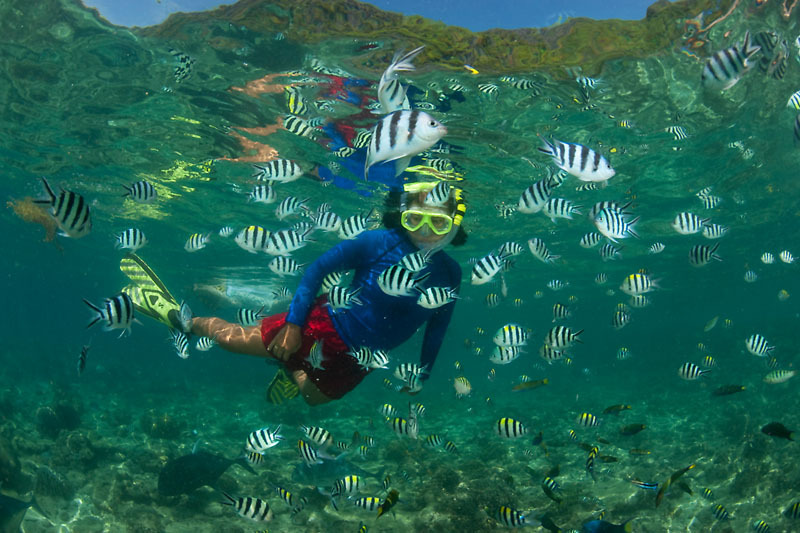 Snorkeler with sergeant major damselfish near Miniloc © Jurgen Freund/WWF-Canon