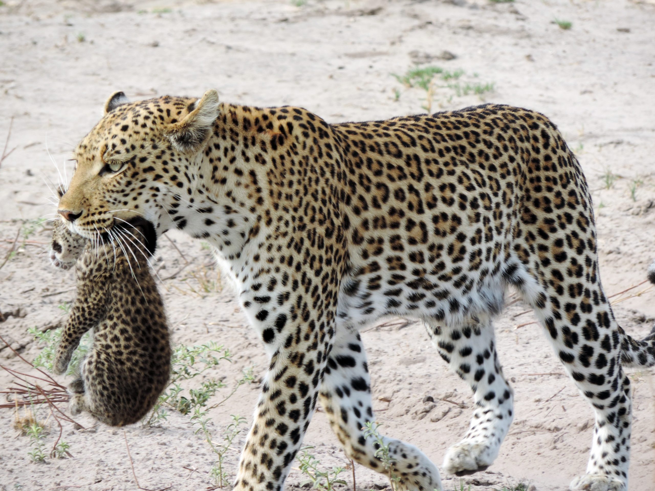 WWF Senior Writer, Deborah Ackerman had a rare and thrilling sight while accompanying a Nat Hab trip through Botswana: a mother leopard carrying her newborn cubs across the KAZA landscape during green season—the time of year when most animals in Botswana’s Okavango Delta give birth.