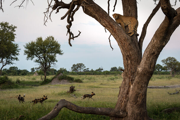 Allen writes on Wilderness Safari’s blog that they had been watching a pack of wild dogs unsuccessfully hunt for impala near Vumbura Plains Camp when two cheetah brothers ambled past. After a few warning calls, the pack surrounded the cats and began to close in. The cheetahs made a quick escape, with one bolting up a nearby tree. According to Allen, after about 90 minutes the coast appeared to be clear and the cheetah jumped to the ground. But a few dogs that had remained nearby noticed what was happening and the chase began anew, sending the cat up another tree. The dogs began to lose interest as darkness started to fall and they drifted off, leaving the cheetah to go off in search of his brother.