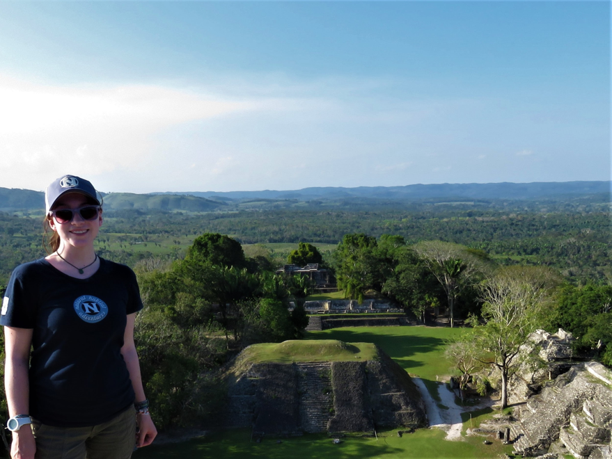 We left the howlers to settle down in the trees and set off to climb the final steps to the very top of the temple. These ones were significantly more steep and narrow than the first, with only a bare rock face to guide us. We passed through a few small enclosed areas inside the structure, where I was startled by some tiny sac-winged bats hiding in the dark corners. The view that awaited me at the top of the temple was incredible. From there, we could see the entirety of the site, as well as across the Guatemalan border, which was barely half a mile away from where we were standing. As the sun fell lower in the sky, the howler monkeys were greeted by another family moving into their territory, and they began screeching at each other from below. They sounded prehistoric, adding another element of disbelief to my experience. That incredible view combined with the wild sounds of the Belizean forest created a surreal moment that I will never forget.