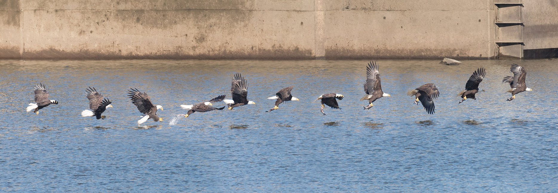 On a late November trip to Conowingo Dam (Conowingo, MD) with some former Nat Hab travelers I met on a trip to Yellowstone, I was afforded the opportunity to photograph dozens of bald eagles as they fished from the Susquehanna River.  The eagles would grab fish from the area below the dam and fly overhead, seeking a secluded spot to eat in nearby trees.  With dozens of eagles in the area, there were seemingly endless opportunities to photograph the birds in flight and fishing.  For the sequence above, I had been following the bird for a few minutes in the air before it made a run near the water and quickly plucked an unsuspecting fish.