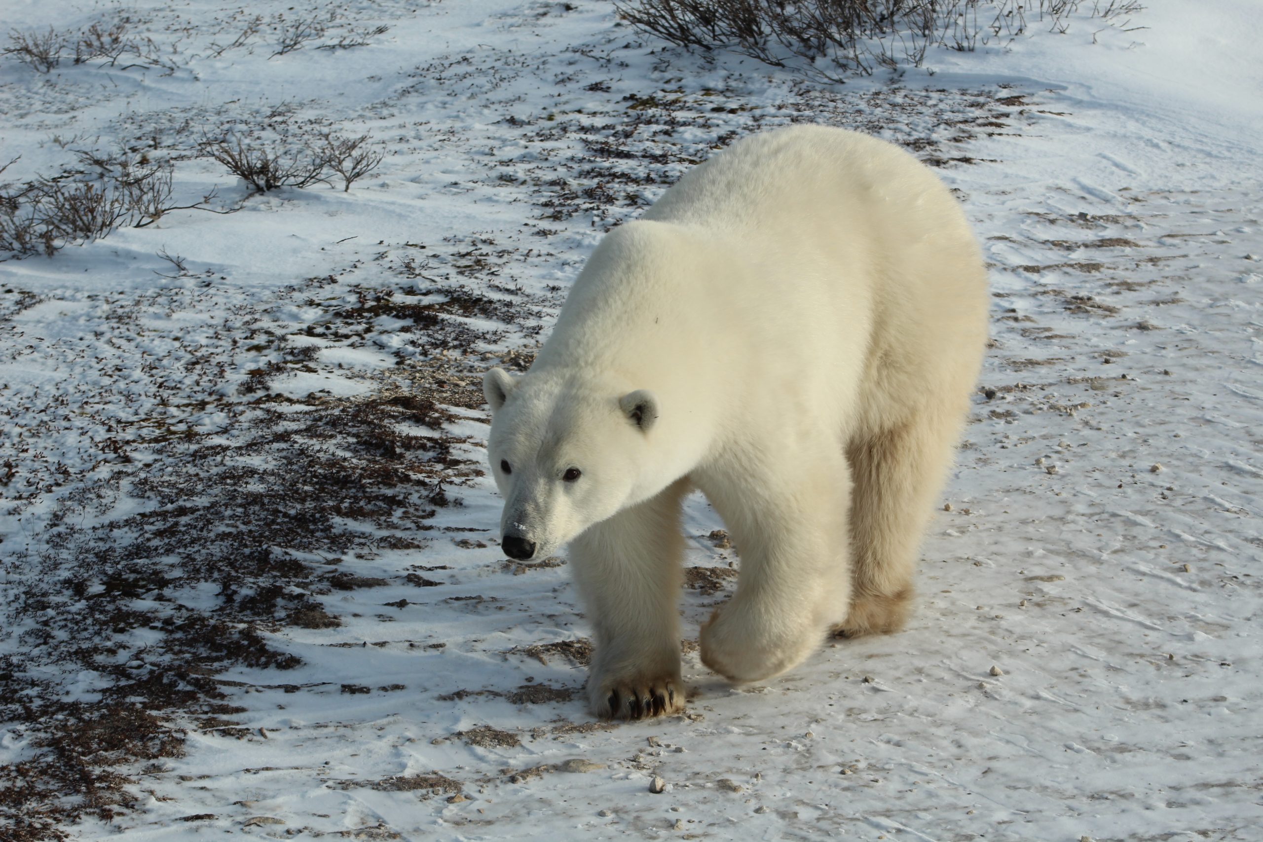 Our last day on the tundra, our group spotted 13 bears. We saw the same mom and two cubs every day we went out. And on the last day, we had two close encounters. First a female, and then a male circled our rover, placing us within 5 feet of these majestic creatures. We passed many others, including a mama bear and cub away from the bay and other bears among the willows on a spit of snowy land surrounding a frozen tundra lake. The young cub put on a show for us – rolling around, cooling off with one rear leg up in the air, and diving again and again into a snow bank with its front paws, mimicking its mama’s behavior by practicing seal hunting. By the time we saw them we had taken loads of pictures, so we were able to put our cameras away and just delight in the experience of watching polar bears in their natural habitat, just being polar bears.