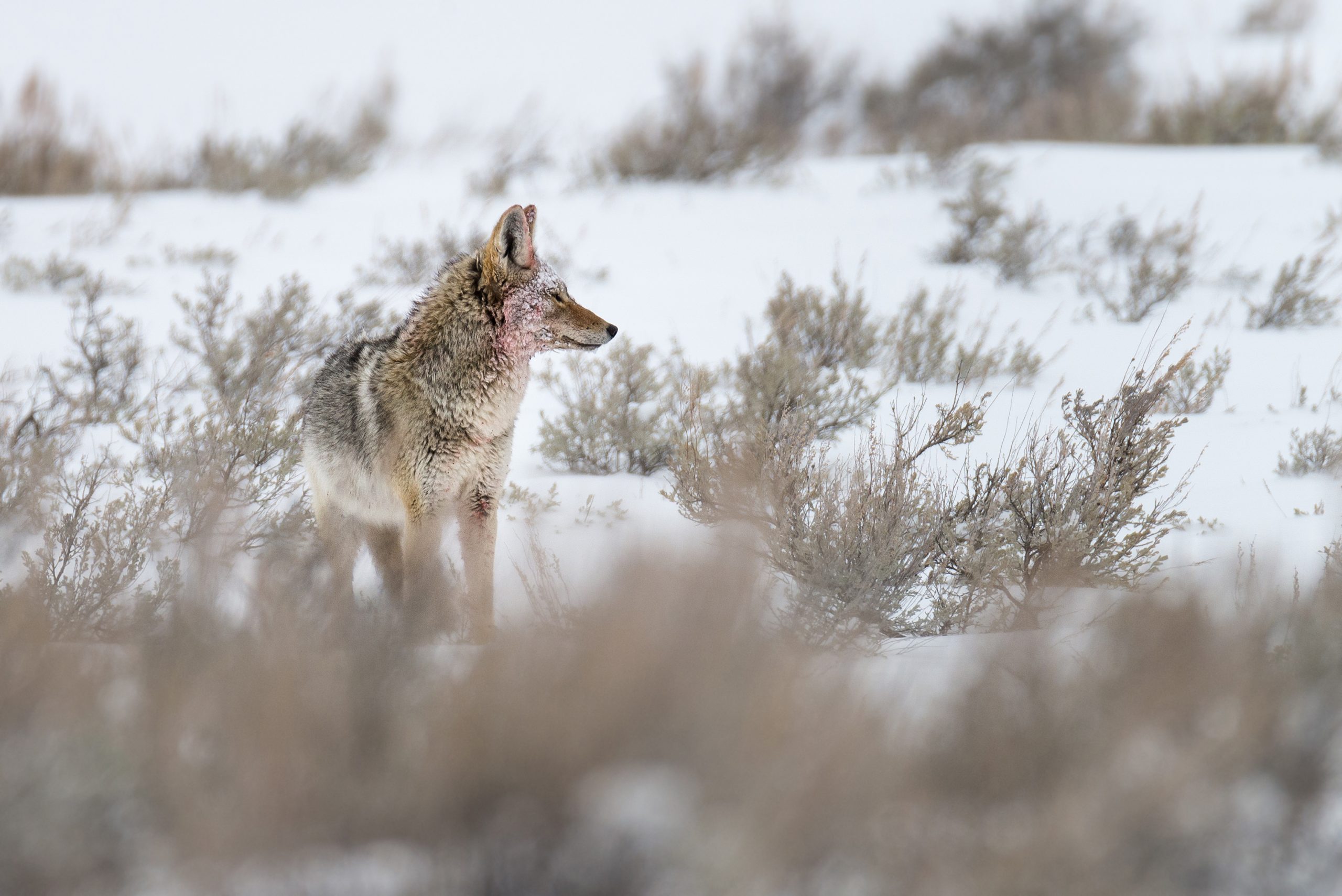 What I liked most about the image was the discolored snow and matted fur on the coyote’s profile head, his ears alert to any sounds coming from the kill site. © Mac Mirabile/WWF-US
