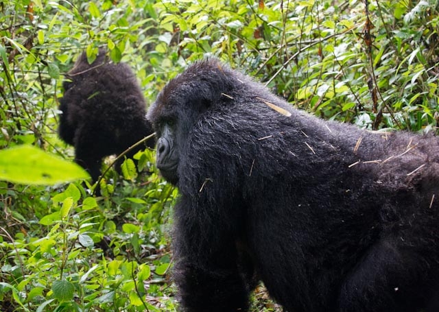The second day, the rain held. We were walking through the forest and then suddenly came upon a clearing where there were about 15 gorillas of all ages. Most of the gorillas were eating and some would put their mouths to the ground and pull up roots. That was pretty funny. There were also a few mothers with babies hanging off them. The kids were eating and running around playing, and the one male silverback just sat with his arms folded, watching everyone. As we were winding down on our hour with the gorillas, the silverback got up and started walking toward us. That was when we got to see how truly huge this animal was. He sat right in front of us, almost like he was posing, and stared at us. Of course, half of us were frozen and the other half were clicking away with cameras. He then got up after a minute or so and walked off. Slowly the rest of the group followed him single file. We followed the group into the forest and then moved to the side as the rest of the group walked right by us. They hardly paid any attention to us. I was kneeling so I got to see eye to eye with them as they walked by.