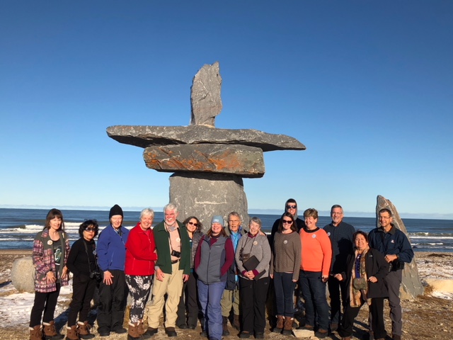 The tour group warmly posing in front of an Inukshuk. Churchill, Manitoba. October 24, 2017. ©Kelly Brasseau/WWF-US