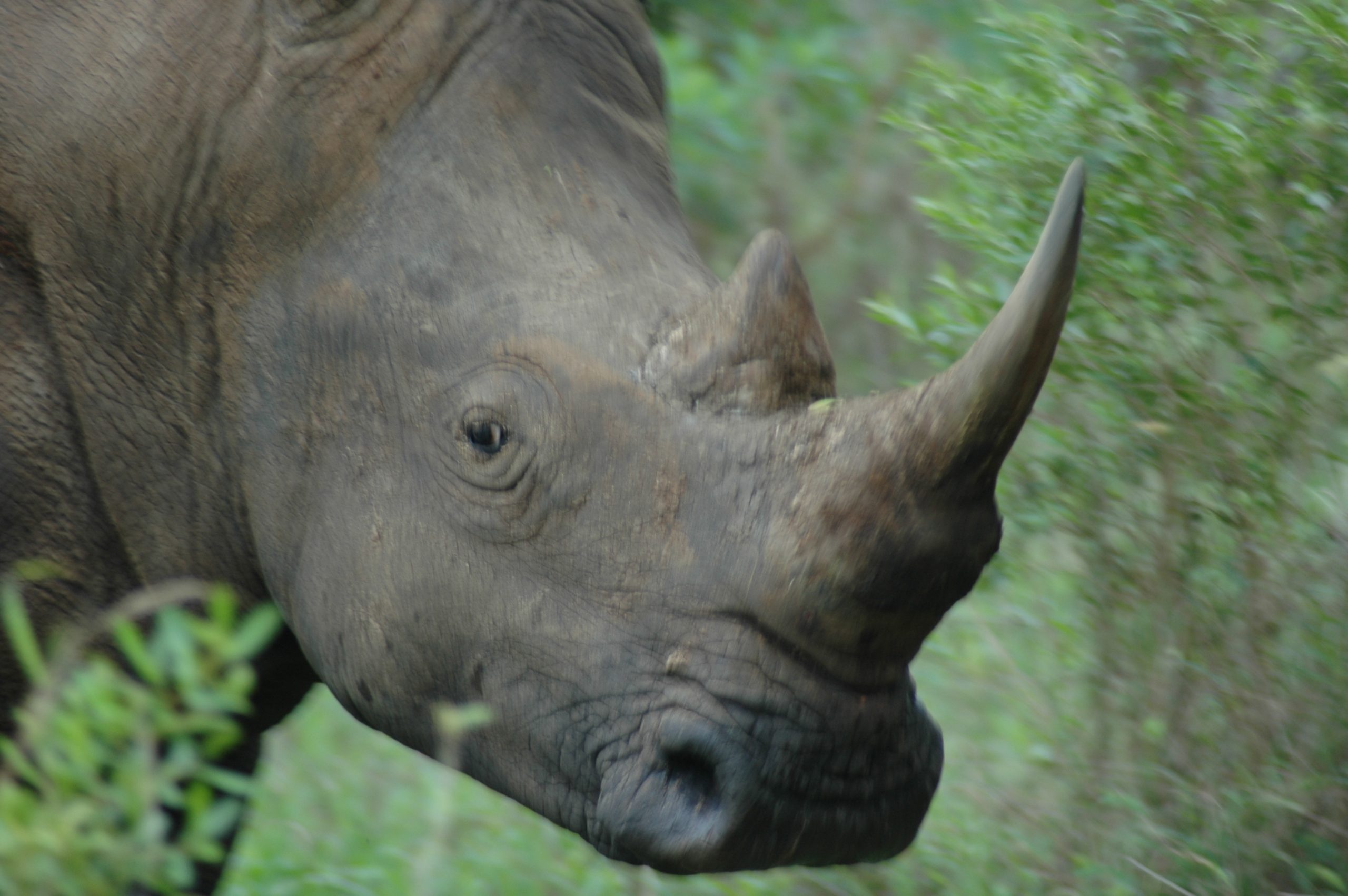 Though there are several differences, the first few times I saw rhinos in South Africa I had trouble distinguishing between the two types of rhinos. After all, even though one is called “black” and the other “white,” they’re actually similar in color. Then someone told me to focus on the mouth—a black rhino’s jaw is pointed and a white rhino’s is square. This significant feature makes them much easier to identify. The white rhino’s square jaw is where its name originated – the Afrikaans word wyd derives from the Dutch, “wijd” (wide), is in reference to the animal’s wide muzzle.