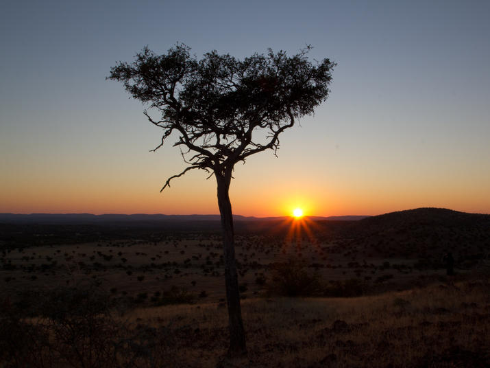 5:37 a.m. – We swung by an area called Zebra Spring, approximately 4 miles from our camp. Black rhinos have been known to frequent this region. One of the guys up top knocks on the roof. Jeff pulls to a sudden halt near a solo tree, grabs his binoculars and hops out, all in one smooth motion. The rest of us sat silent.