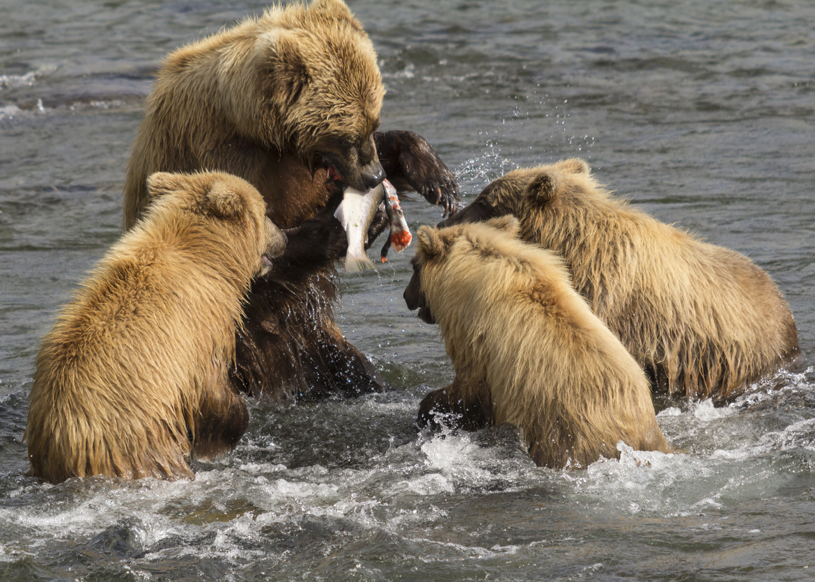 Photographer Bill Galloway took hundreds of photos of the brown bears of Katmai while visiting Alaska. Here, a mother bear catches salmon for her three cubs.
