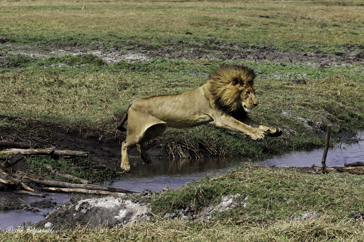 While on safari with Nat Hab, photographer Jim Trojanwoski photographed this lion who decided to cross a narrow waterway near Busanga Bush Camp.