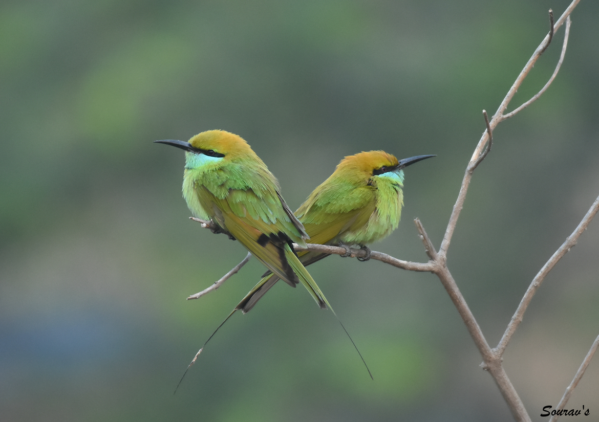 Photographer Sourav Mookherjee captured these green bee-eaters sitting together in Telegana, India.