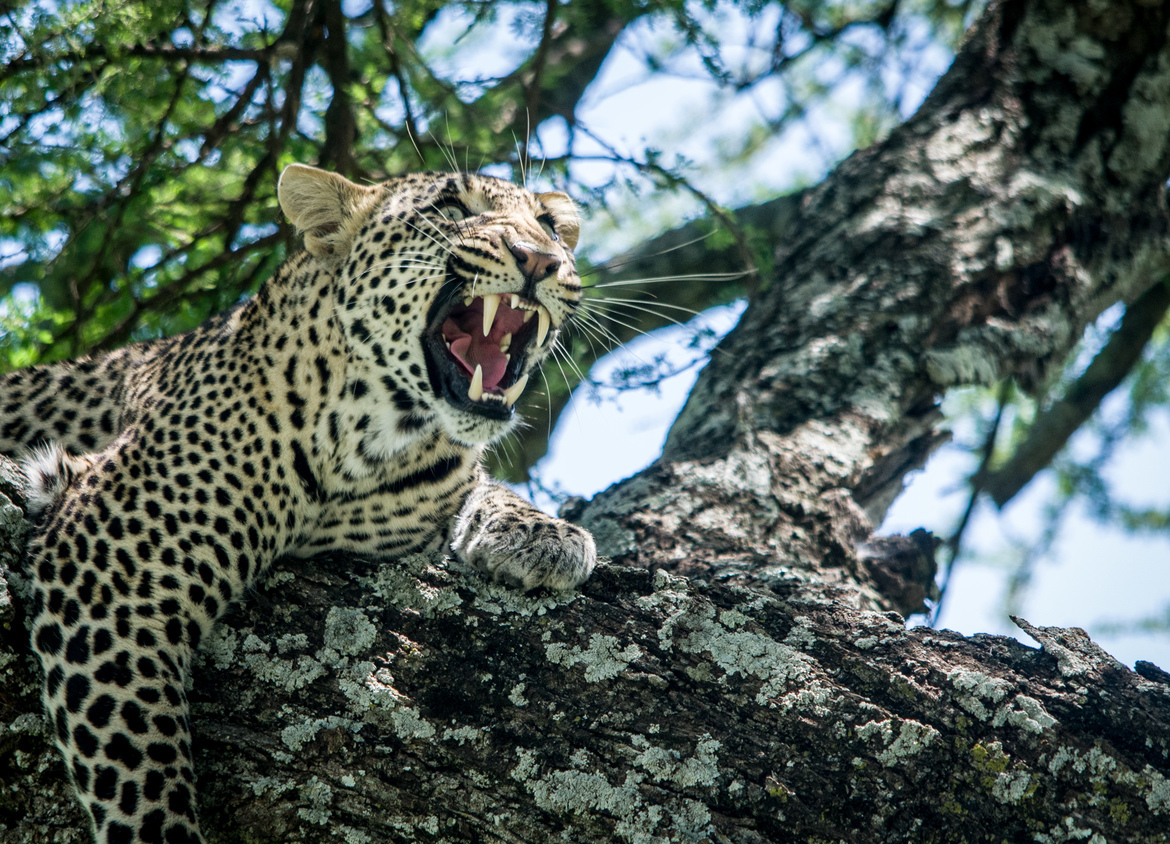 Photographer Ed Dornfeld captured this moment while on safari in the Serengeti. After hours of watching the leopard sleep in the tree, it woke up with a big stretch.